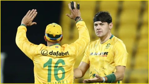 गेराल्ड कोएत्जी ने चटकाए तीन विकेट: साउथ अफ्रीका के लिए तेज गेंदबाज़ गेराल्ड कोएत्जी सबसे कामयाब बॉलर रहे जिन्होंने 3.5 ओवर में न्यूजीलैंड को 31 रन देकर 3 विकेट झटके। उनके अलावा ओटनील बार्टमैन, प्रेनेल सुब्रयेन और केशव महाराज ने 2-2 विकेट निकाले और वियान मुल्डर को एक विकेट मिला।