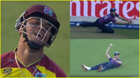 जी हां, ऐसा ही हुआ। दरअसल, ब्रैंडन मैकमुलेन का ये कैच वेस्टइंडीज की इनिंग के 19वें ओवर में देखने को मिला। स्कॉटलैंड के लिए ये ओवर तेज गेंदबाज़ सफयान शरीफ करने आए थे जिनकी आखिरी गेंद पर शिमरोन हेटमायर ने लॉन्ग ऑन की तरफ हवाई शॉट खेला।
