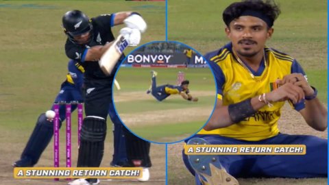 टी20 वर्ल्ड कप 2026 के सुपर-8 के मुकाबले में श्रीलंका के स्टार स्पिनर महेश थीक्षाना ने न्यूजीलैंड के सलामी बल्लेबाज फिन एलन का खेल जल्दी ही खत्म कर दिया। अपनी ही गेंद पर डाइव लगाते हुए उन्होंने खूबसूरत रिटर्न कैच लपका और टीम को शुरुआती सफलता दिलाई।