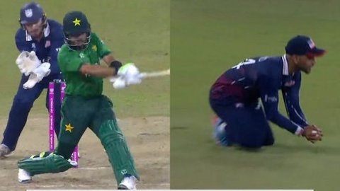 पाकिस्तान की पारी के 15वें ओवर में बाबर आज़म तेज़ी से रन बटोर रहे थे और अर्धशतक से महज़ चार रन दूर थे। यूएसए के स्पिन गेंदबाज मोहम्मद मोहसिन की शॉर्ट गेंद पर बाबर ने लेग साइड की ओर बड़ा शॉट खेलने की कोशिश की, लेकिन बल्ले का ऊपरी किनारा लग गया और गेंद लॉन्ग ऑन की दिशा में हवा में चली गई।
