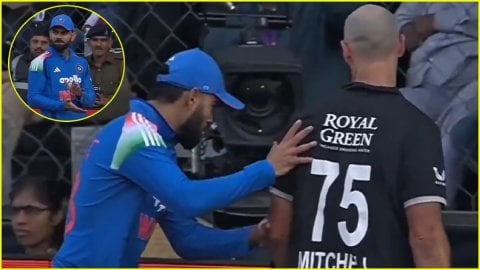 जी हां, ऐसा ही हुआ। दरअसल, ये पूरी घटना न्यूजीलैंड की इनिंग के 45वें ओवर में घटी। भारतीय टीम के लिए ये ओवर तेज गेंदबाज़ मोहम्मद सिराज करने आए थे जिनकी पहली ही गेंद पर डेरिल मिचेल ने गलती की और कुलदीप यादव को कैच देकर अपना विकेट खो दिया। इसके बाद जैसे ही वो पवेलियन की तरफ लौट रहे थे, तब बाउंड्री के पास खडे़ भारत के महान बल्लेबाज़ विराट कोहली ने ताल्लियां बजाकर उनका सम्मान किया और फिर उनके साथ मस्ती करते हुए उन्हें पीछे से धक्का देकर पवेलियन की तरफ भेजा।