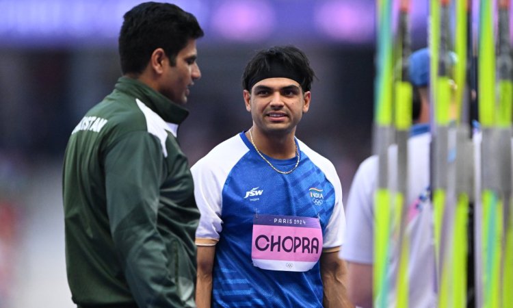 Saint-Denis: India's Neeraj Chopra with Pakistan's Arshad Nadeem during the men's javelin throw qual (Image Source: IANS)